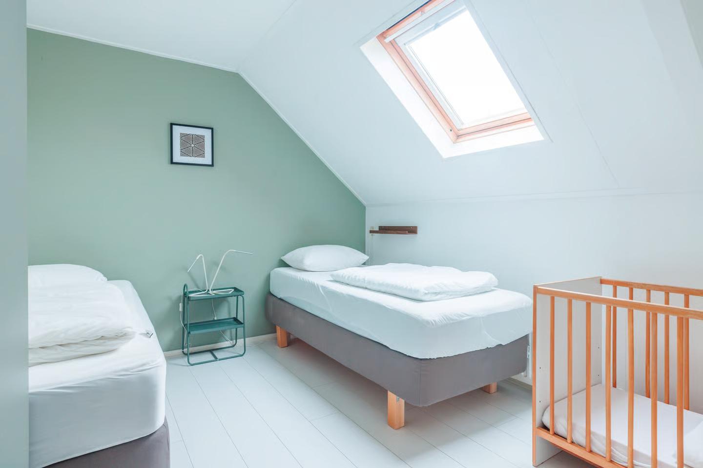 Alle slaapkamers zijn ruim en licht. Op de begane grond is naast de ruime badkamer met douche, toilet en dubbele wastafel, een slaapkamer met drie 1-persoonsbedden. Op de verdieping zijn 4 slaapkamers waarvan twee met 2-persoonsbed, een slaapkamer met drie 1-persoonsbedden en een slaapkamer met twee 1-persoonsbedden en een kinderbedje. Op de verdieping is tevens de 2e badkamer met douche, toilet en wastafel.